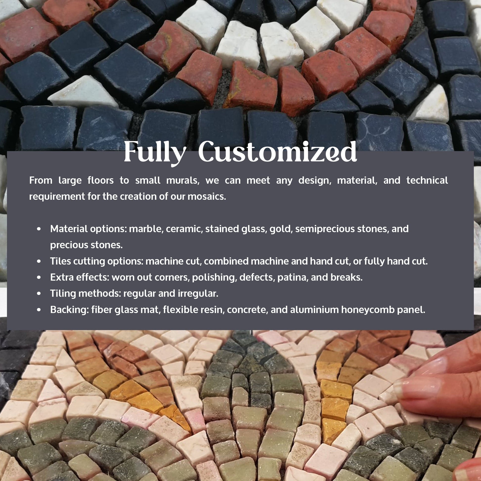 Our marble mosaics are handmade reproductions crafted using a blend of modern and ancient techniques. They are cherished in luxury homes for their uniqueness and beauty. Marble mosaics are the epitome of captivating d¨¦cor.