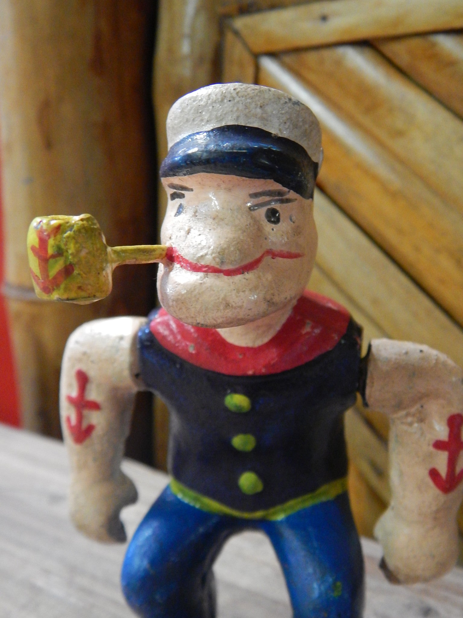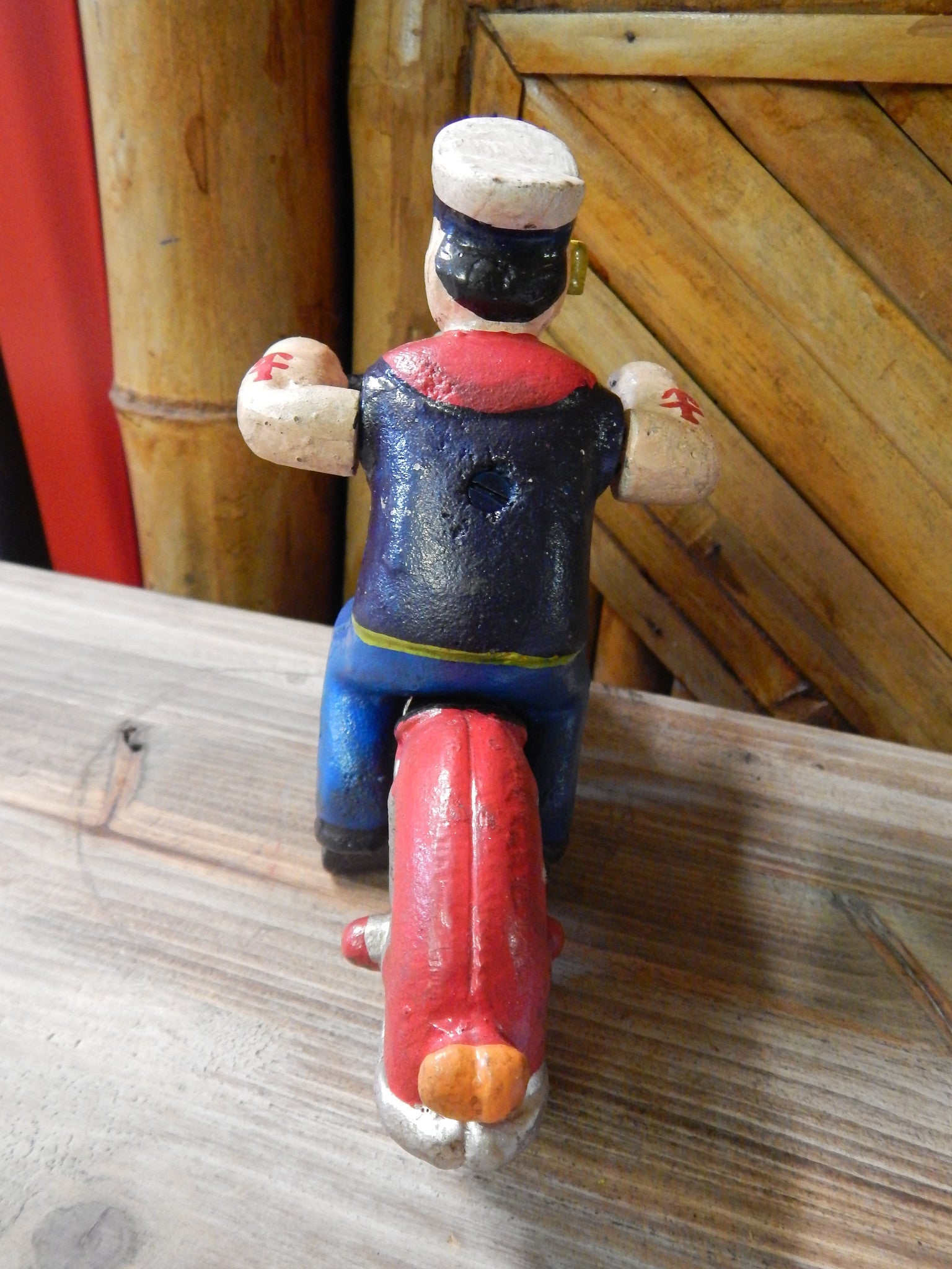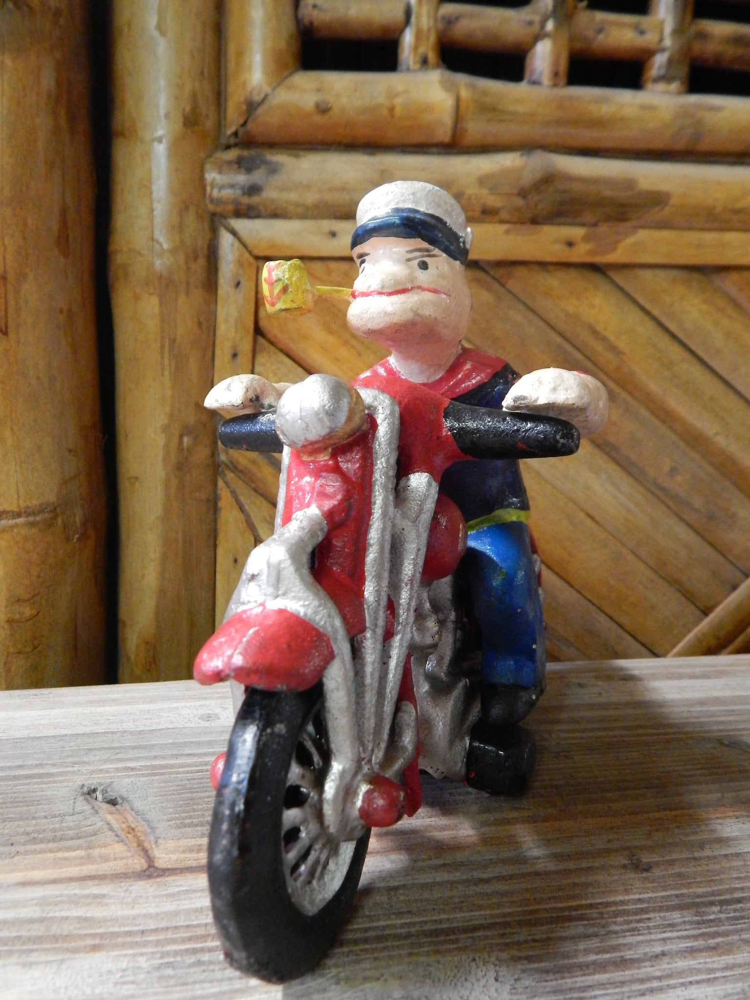 This is a Cast Iron Popeye Figure on Motorcycle Patrol.