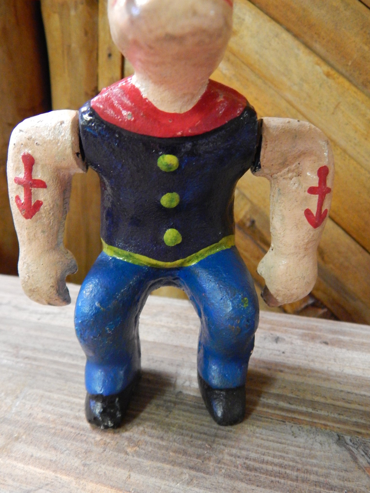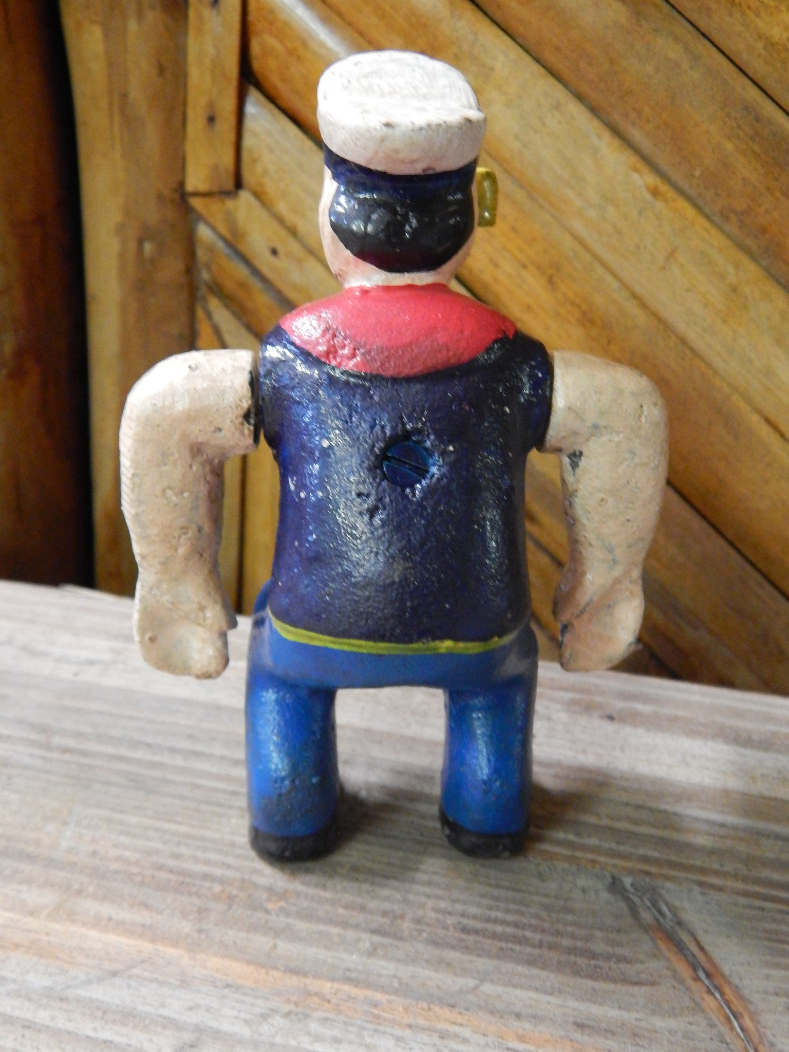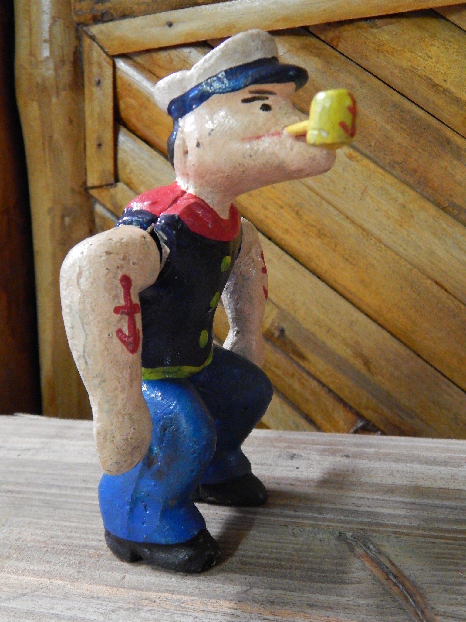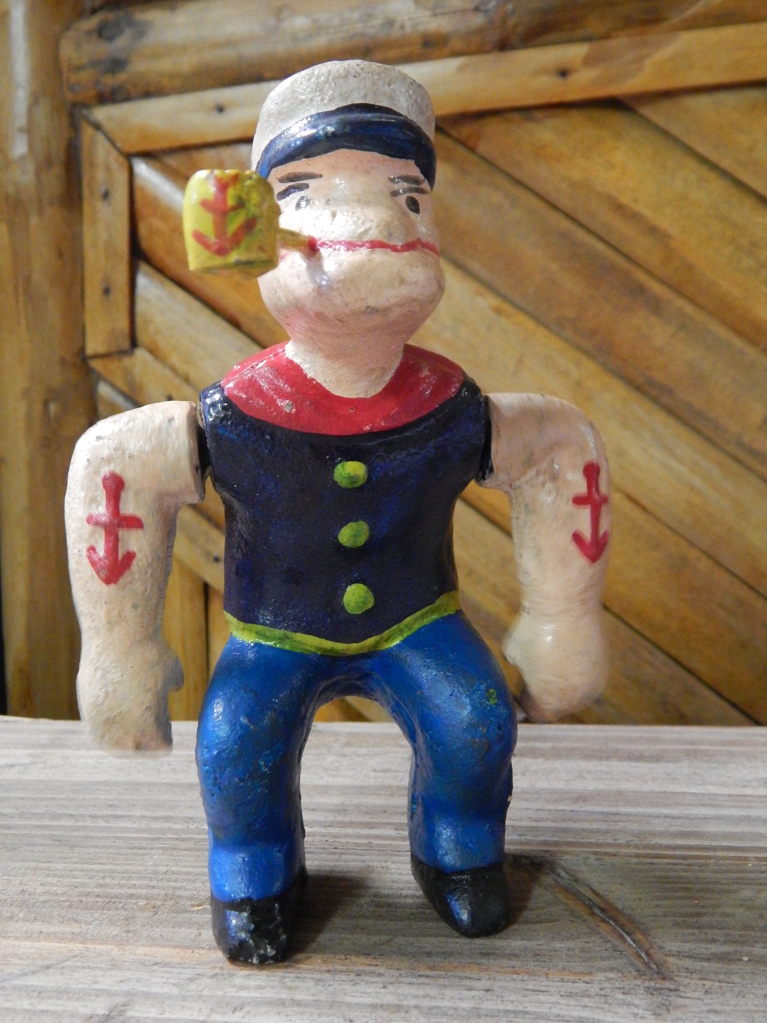 This is a Cast Iron Popeye Figure on Motorcycle Patrol.
